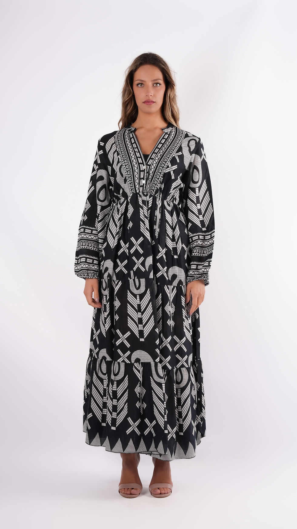 Abito da mare, lungo e realizzato con un tessuto traforato, probabilmente all'uncinetto o con una maglia a rete. Presenta un design leggero e arioso, ideale per una giornata in spiaggia. Il taglio è aderente e avvolge il corpo, valorizzando la figura. Ha spalline sottili e uno scollo a V che aggiunge un tocco femminile e delicato. La trama aperta del tessuto permette di intravedere il costume da bagno sottostante, rendendolo sia pratico che elegante.